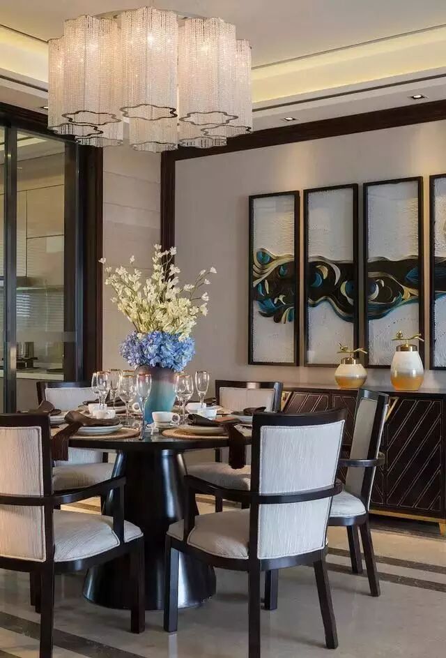 圆形的餐桌非常符合中国人的思维,代表着团圆的意思,一束大大的鲜花放在桌子正中央,看着心情好好,吊灯的造型也非常有特色,光彩照人