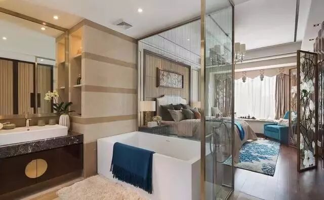 主卧中的卫生间设计,有一种温馨又浪漫的感觉,显得分外的靓丽,大大的浴缸也满足了女主泡澡的需求,玻璃式的隔断搭上纱帘的装饰,有种若隐若现的感觉