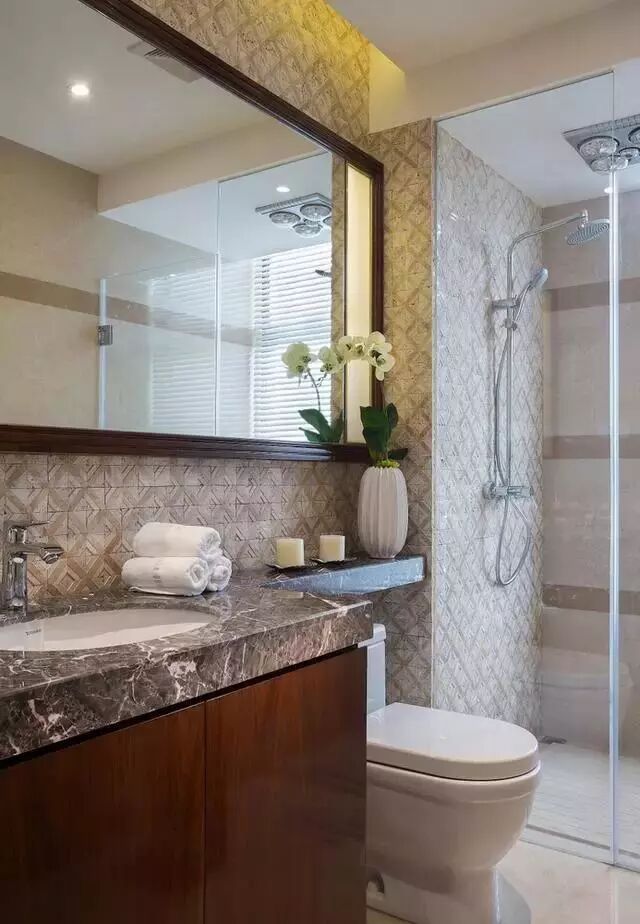 用大理石打造的台面,显得很有质感,干湿分离的设计,极大的满足了用户需求,花纹式的墙砖,则使空间看上去不那么单调乏味