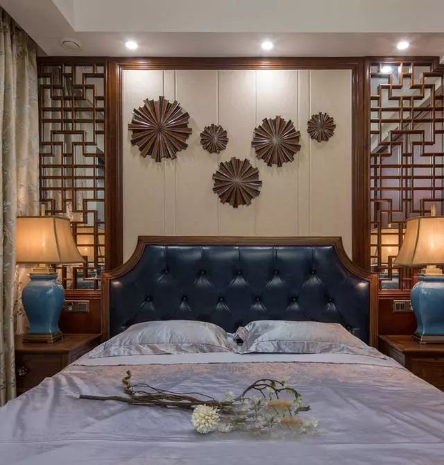主卧床头背景的设计堪称一绝,两侧的镂空屏风更是韵味十足,整个空间布局端庄禅意。