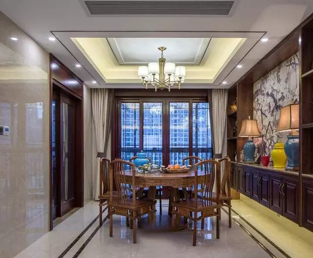 餐厅背景墙选择了客厅同款,保持整体风格的高度统一;悬空餐边柜搭配陶瓷制品,端庄又稳重;这套中式雕花桌椅,尽显古韵古调。