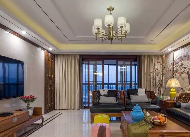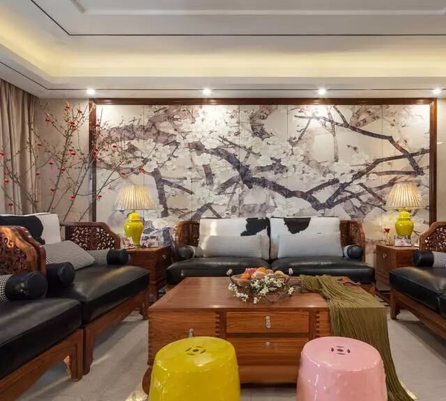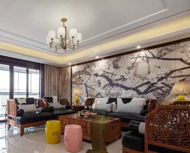 客厅沙发墙以大幅梅花壁画做背景,辅以实木边框点缀,端庄禅意;这套实木雕花沙发,搭配黑白皮质坐垫,稳重大气;一角的红梅观景更添一分意境;黄色和粉色鼓凳的加入,则让整个空间变得更加活泼靓丽。