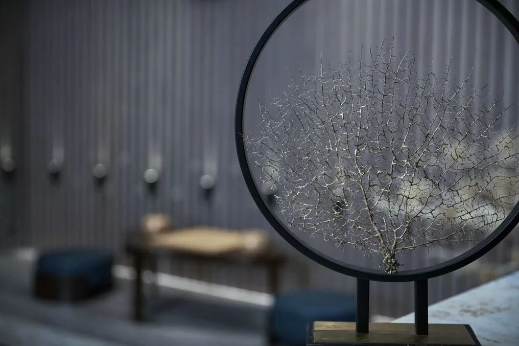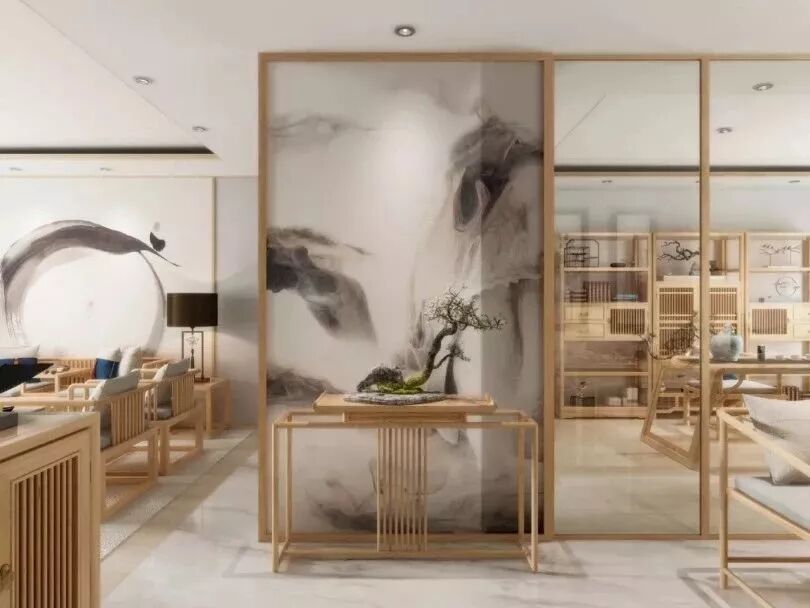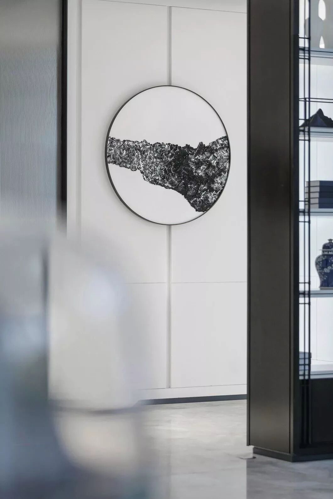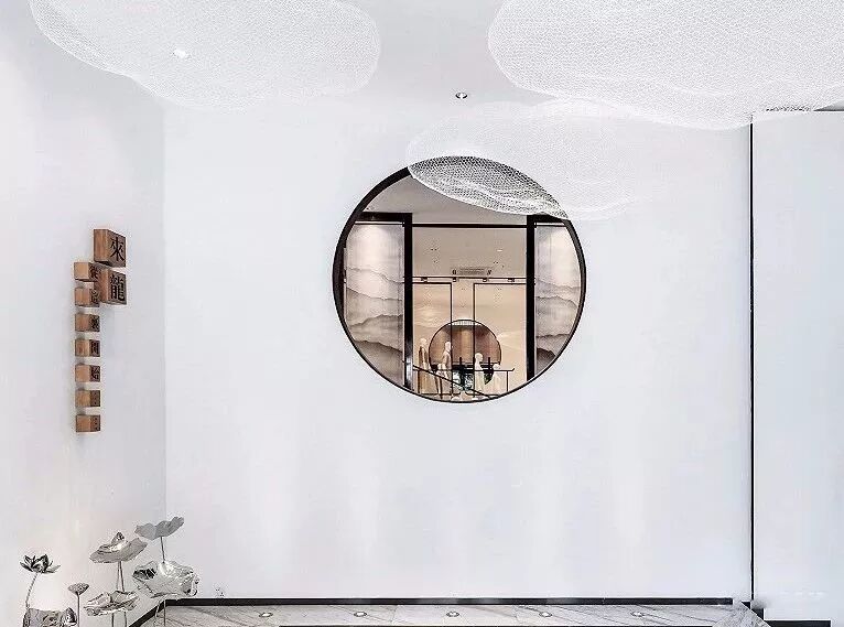 这种留白不等于数学上的零,它不是乏味的白,笼统的白,没有生命力的白,而是与水墨画、圆框、博古架、原木家具等充分融合,让人仿佛处于无限的虚实更迭空间中。