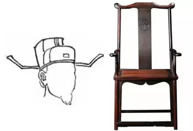 “官帽”是因为椅子的靠背和扶手的造型非常像宋朝官员的帽子,这种帽子俗称“三片瓦”前面一片高,两边对称低矮,官员的帽子代表升官发财。所以四处头官帽椅就有了多种吉祥寓意。