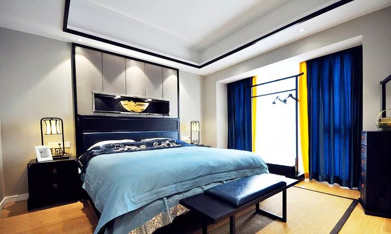 卧室吊顶线条及配色都采用现代的方案,简洁直接,中式家具又把审美拉回到中式,天青和靛蓝色的软装与同样是中式的大红,烫金相比更加素净、淡雅。