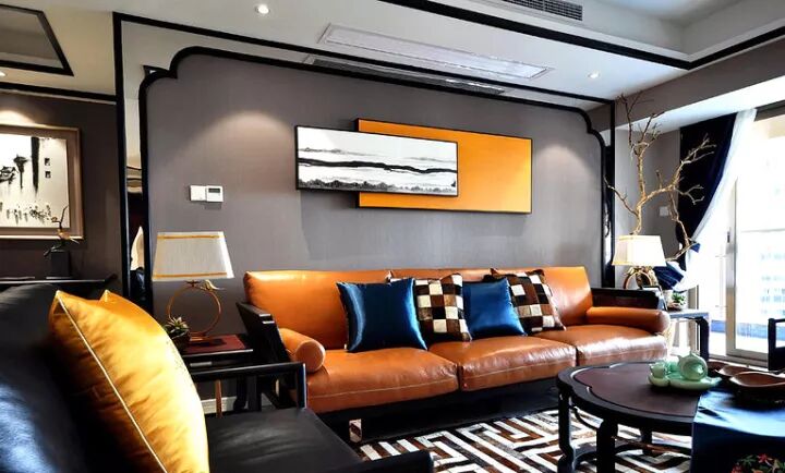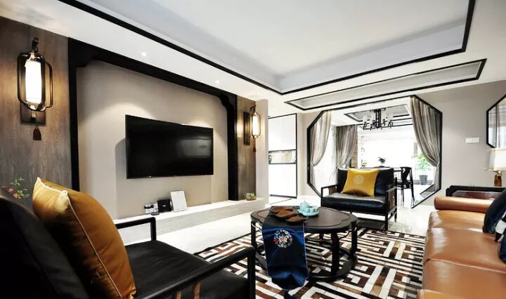 灰色的电视背景墙风格明显,两边的灯笼营造出一种深宅大院的既视感,坐在沙发上看过去即可知道何为厚重感?