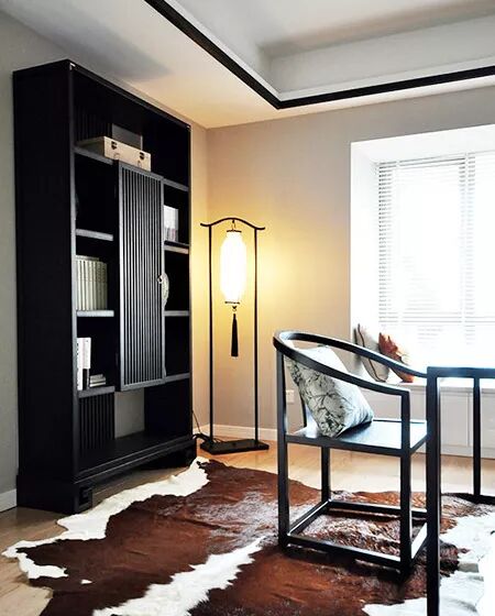 将东方元素与极简主义相融合,有传统书柜,桌椅,还有飘窗,古典与现代相结合,同时为了解决书柜储物空间的局限,在飘窗下布置了一排柜子,实用性也得到很好的照顾。