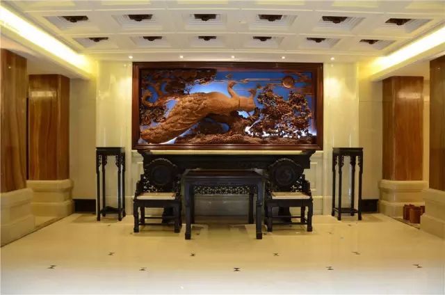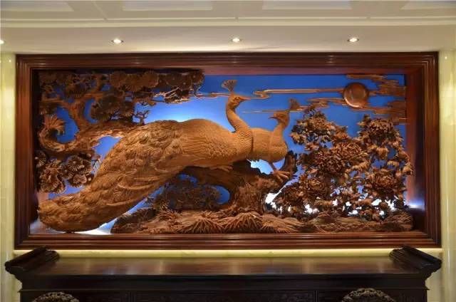 中堂背景墙里两只孔雀雕刻的栩栩如生。
