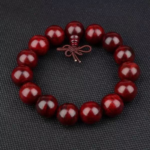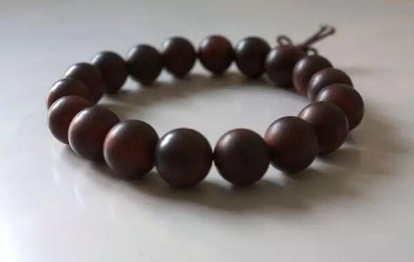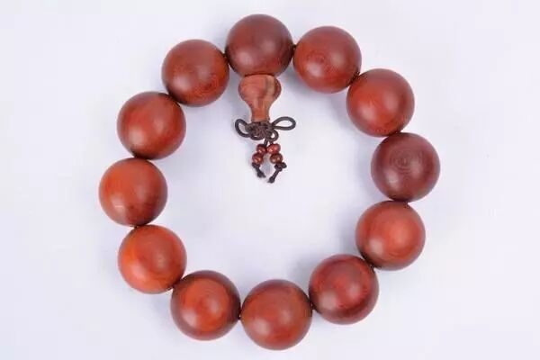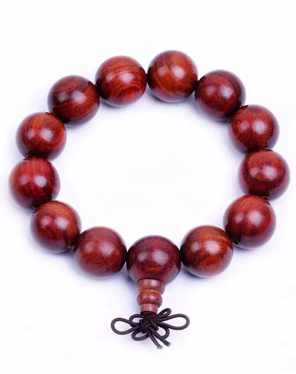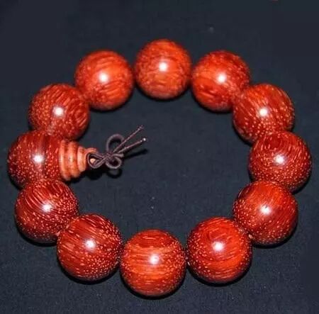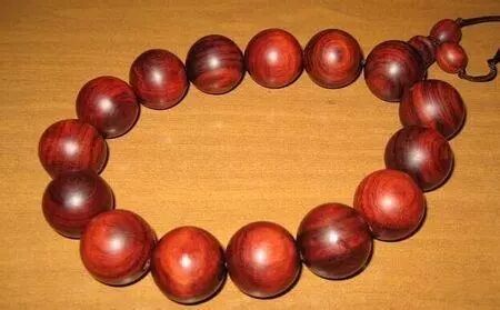 这个是很多朋友容易弄混的,因为很多商家就管这个叫紫檀,不提大叶两个字,其实它的学名是卢氏黑黄檀,多数也不会做成顺纹,加工工艺一般都比较粗糙,但也有个别工艺良好的顺纹手串,很直观的方法是强光下看他的底色,新串的底色是大红,而且棕眼的颜色都很深,整体没有小叶的那种清新感觉。