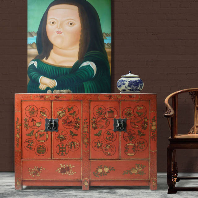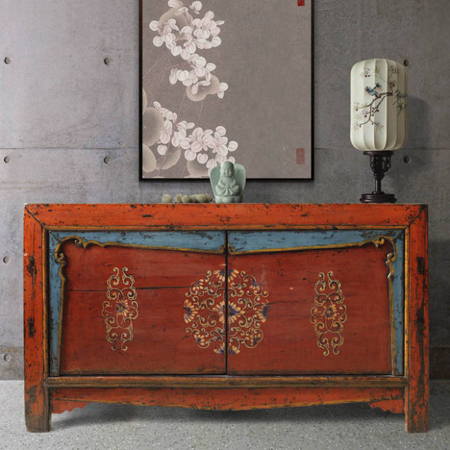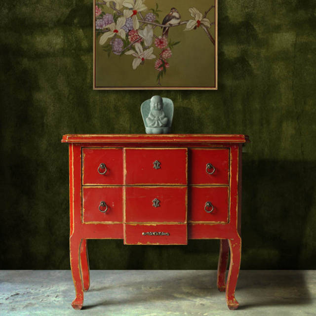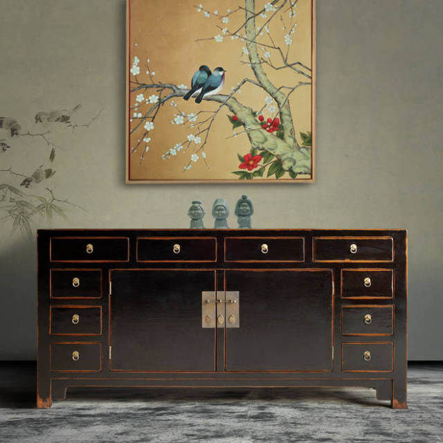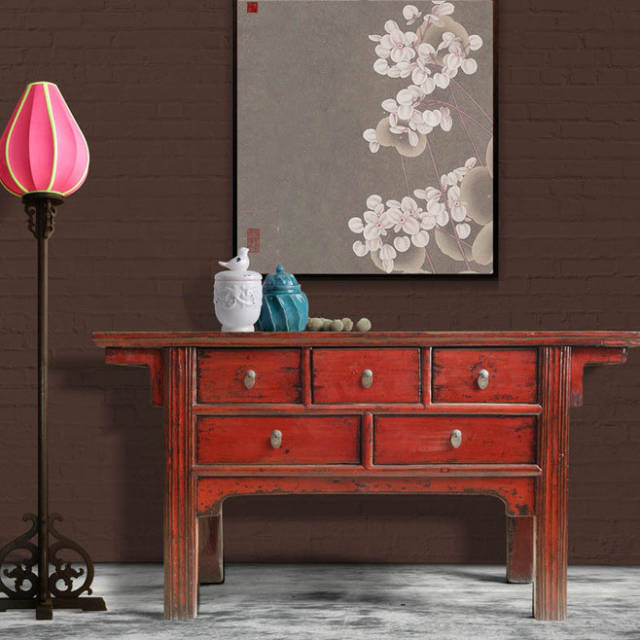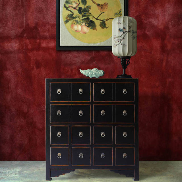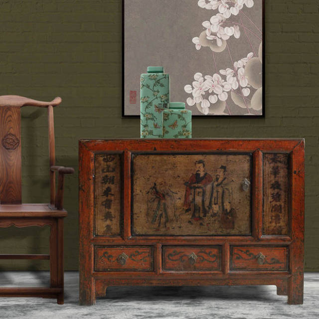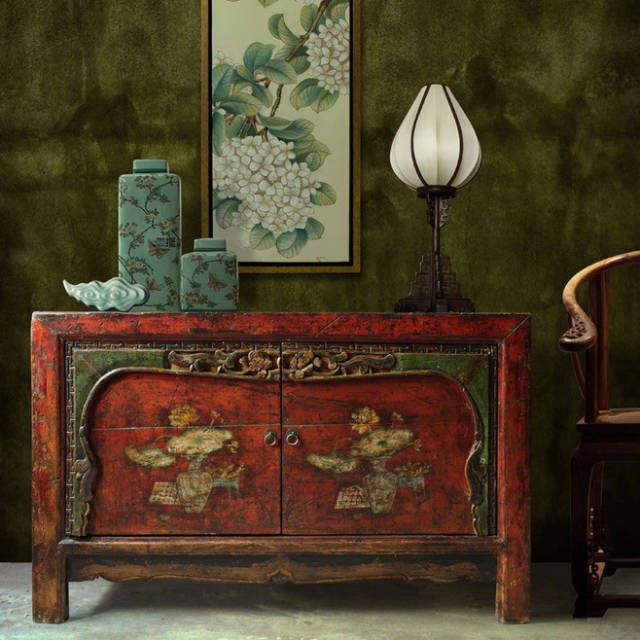 家具做旧的棱边处理更突显出时间的洗刷和积淀,背景上写意画卷似乎在诉说某个回忆。浓郁的传统东方风情此刻灵动于画面之上。