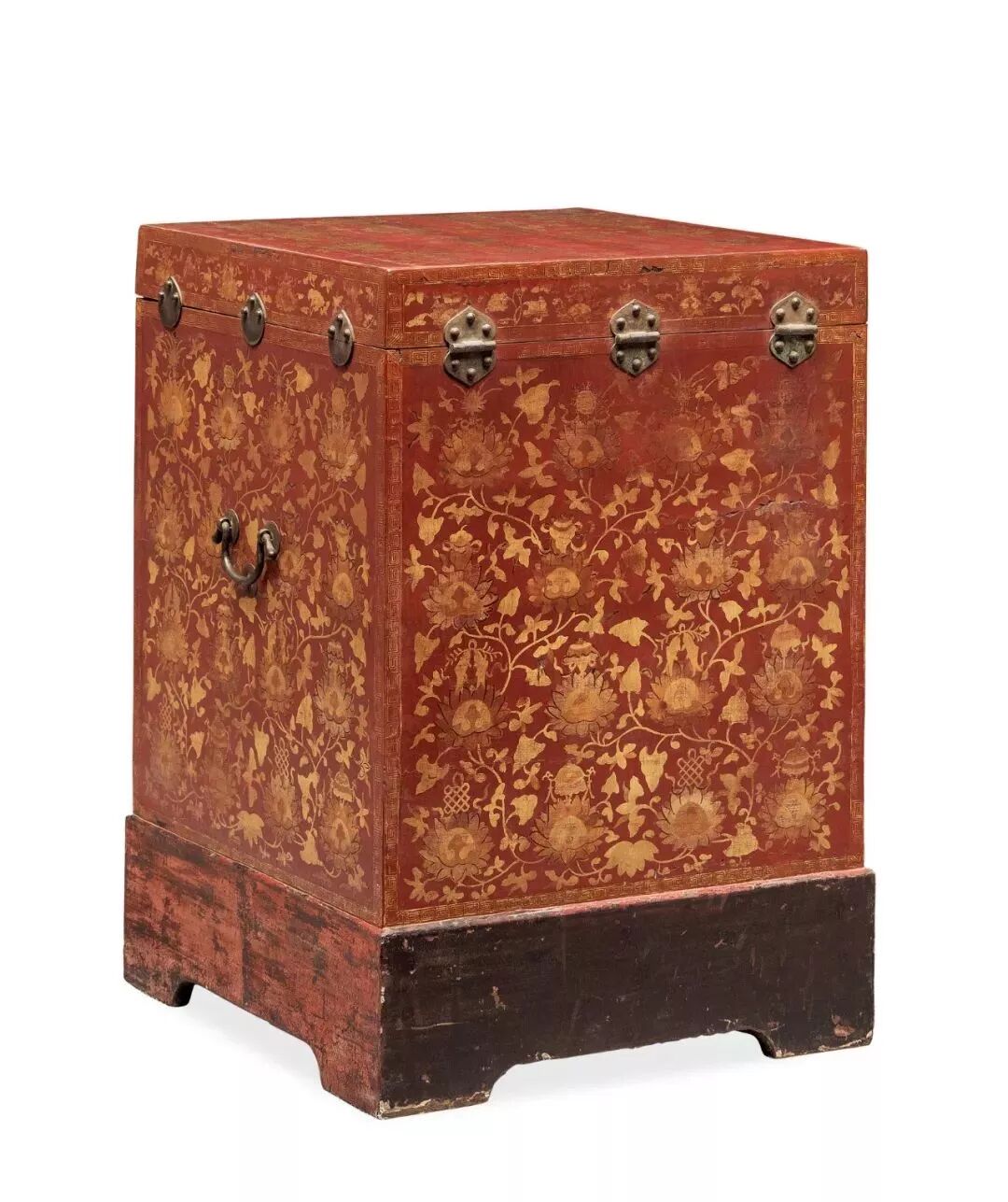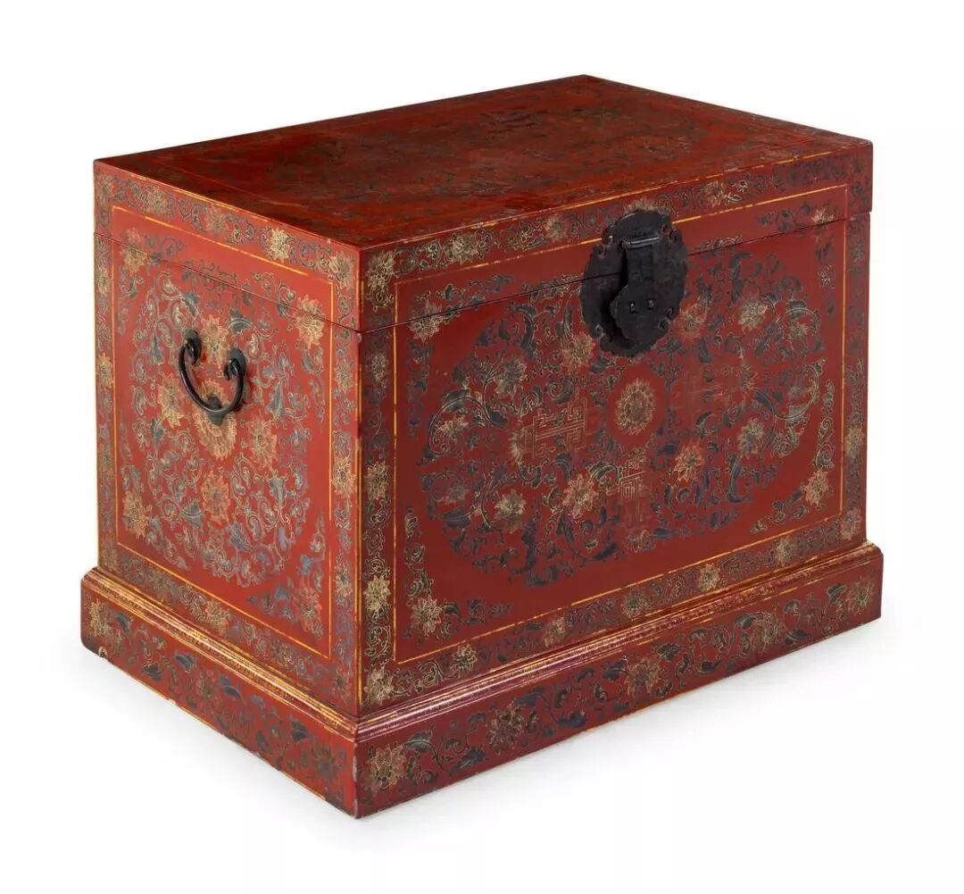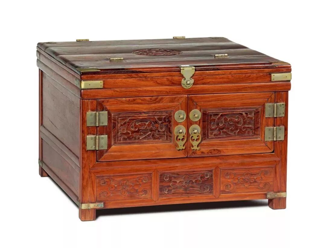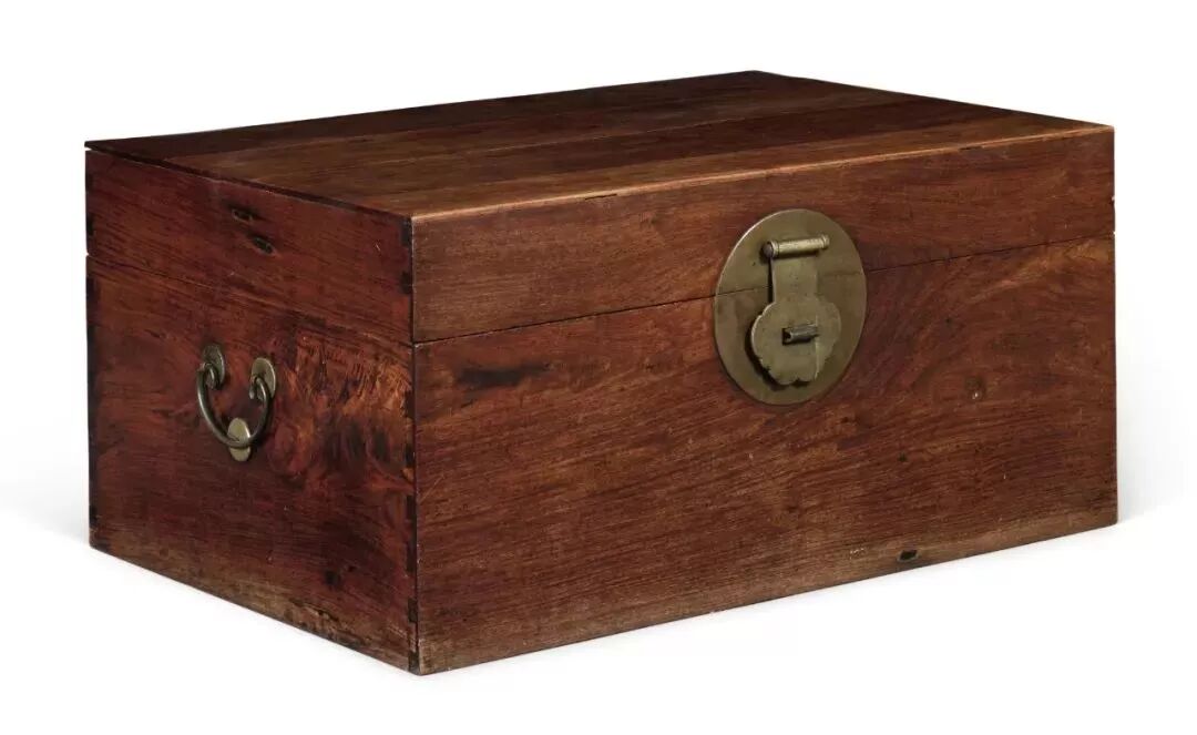 衣箱,一般为板式结构,上开盖,正面有铜饰件, 钉鼻钮可以上锁,拉环在两侧。 不过衣箱作为古代大型的箱匣类家具, 用途不止贮藏衣物, 还可用于储藏金银财宝、书籍字画等贵重物品。