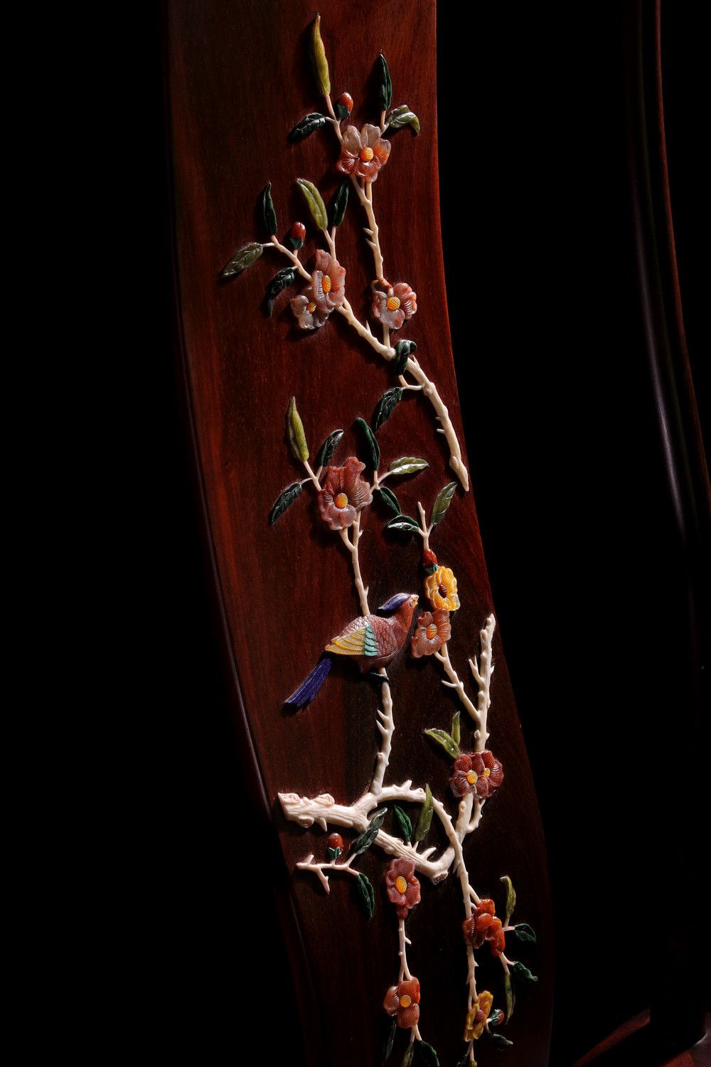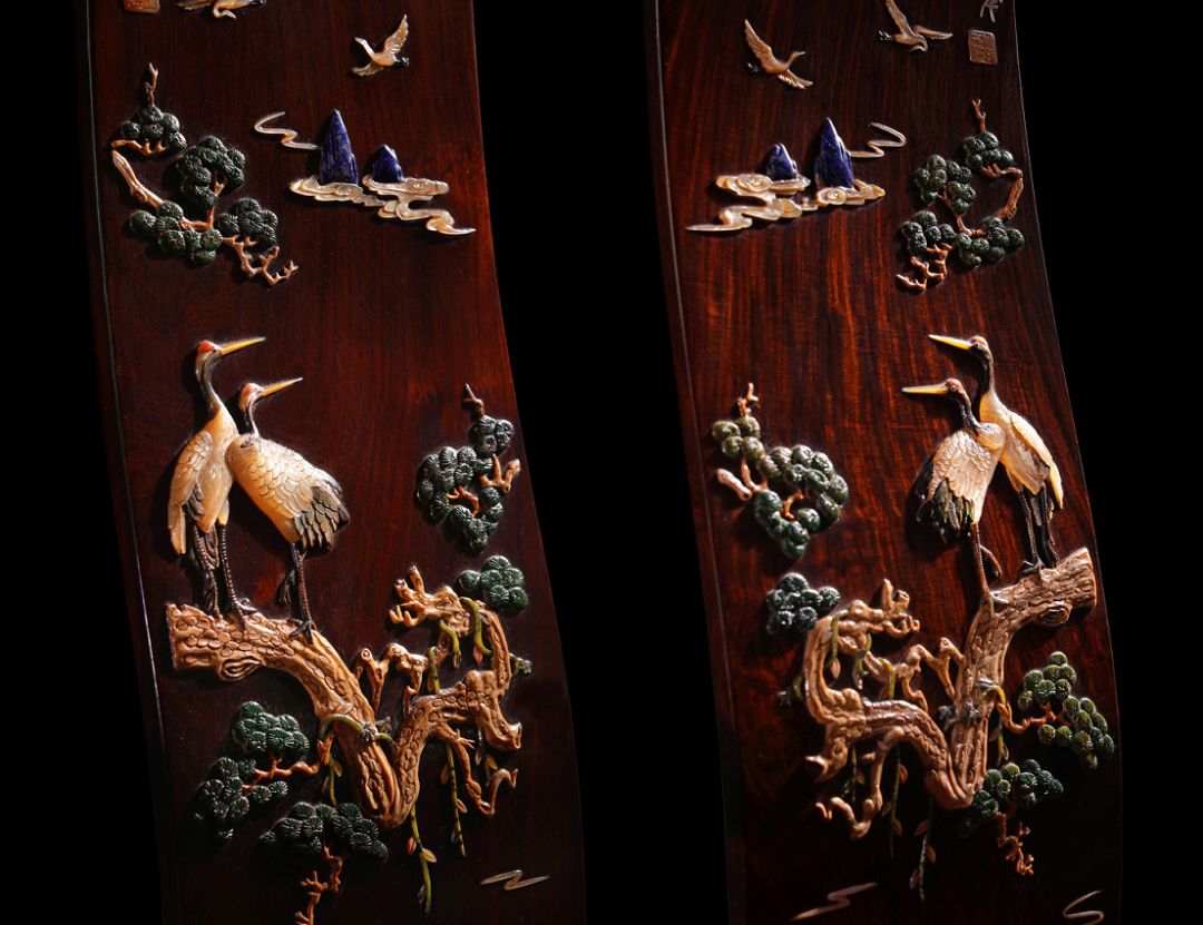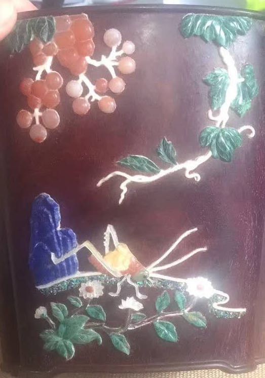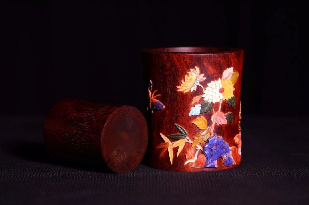 以上交代了百宝嵌的来源背景,那现代百宝嵌工艺还在吗?当然是还存在的,百宝嵌工艺一直留存至今,还被应用在各式各样的红木家具上面,不只是屏风,大到官帽椅,小到文案上的笔筒,都有采用百宝嵌工艺。前端时间展示了一些百宝嵌的官帽椅,就有一些看官私信问,这个百宝嵌会不会掉落啊,毕竟都是宝石、翡翠、玛瑙之类的。这里可以很放心的告诉你们,一般不会掉,这里的一般指的是正常使用,只要不人为故意去抠弄,或者用工具去撬,正常情况会跟着您的椅子流芳百世。