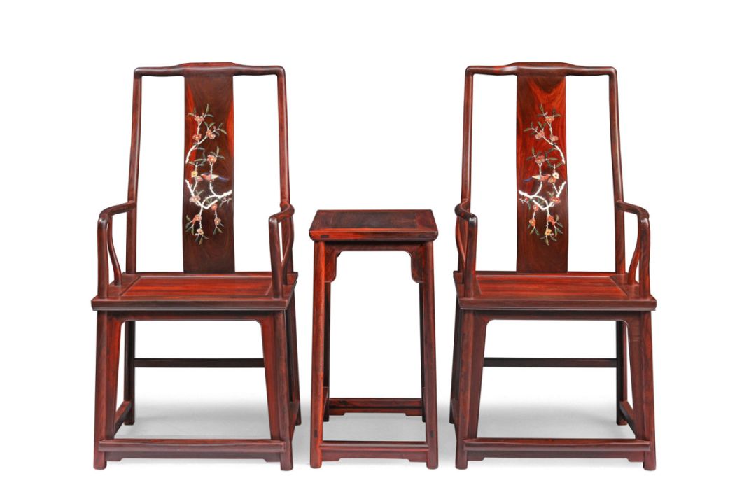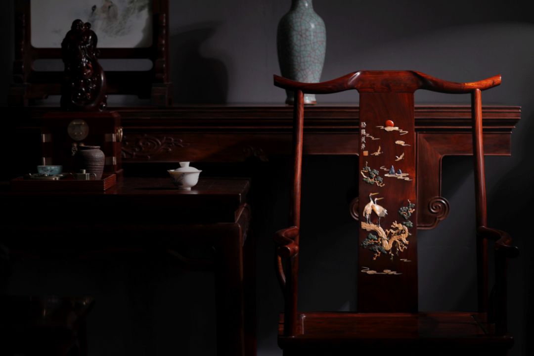 大红酸枝百宝嵌松鹤延年独板官帽椅三件套