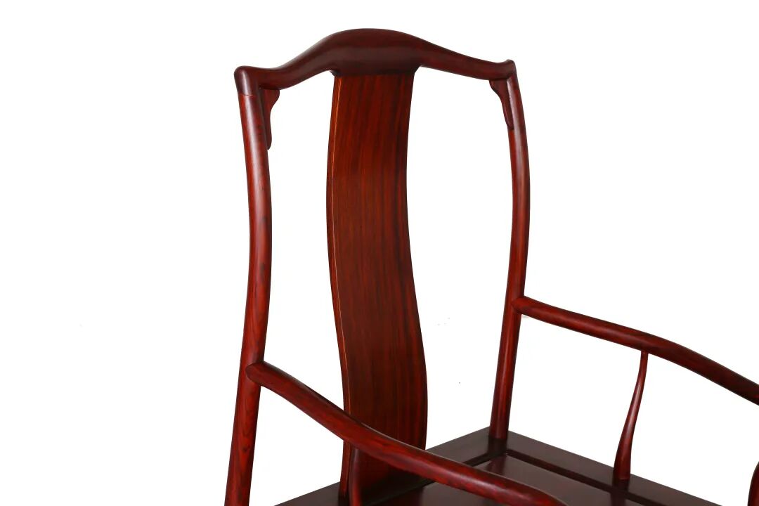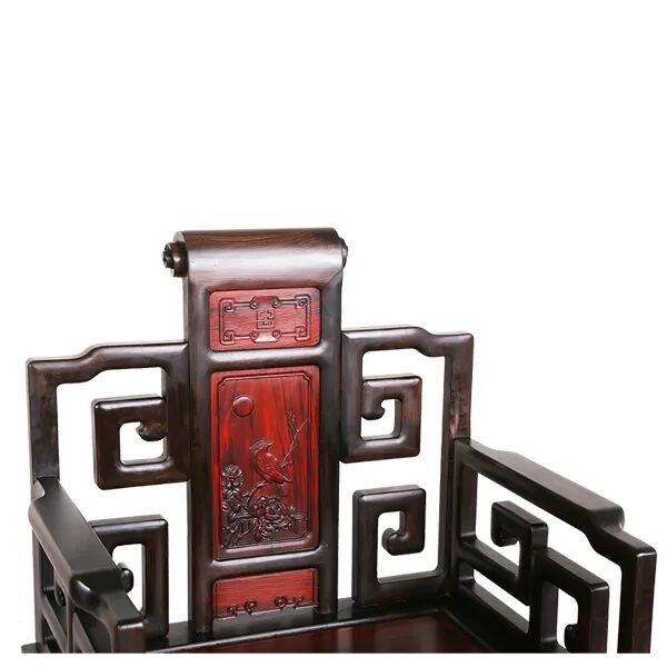 卷书形搭脑是背板过肩突起形成搭脑,背板上部微向后倾斜且向后卷曲,从侧面的状态来看,似卷书形状。卷书形搭脑因其独特的外形,增强了搭脑整体的体量感和稳重性。