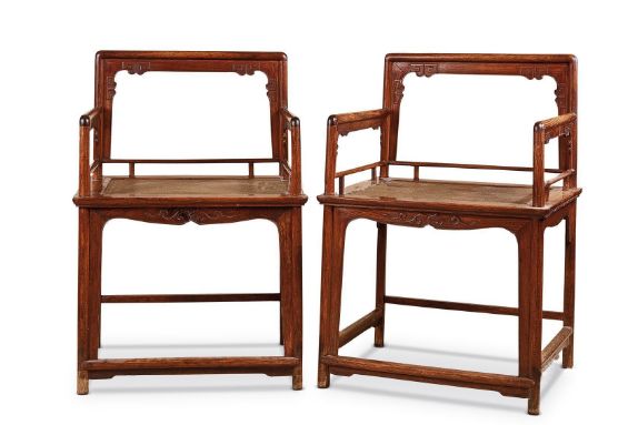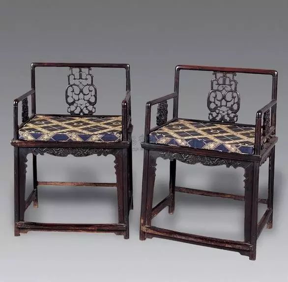 曾见铁力制的一对,靠背及扶手用三块寸许厚的独板造成,板外面光素,里面各浮雕寿字花纹一组。