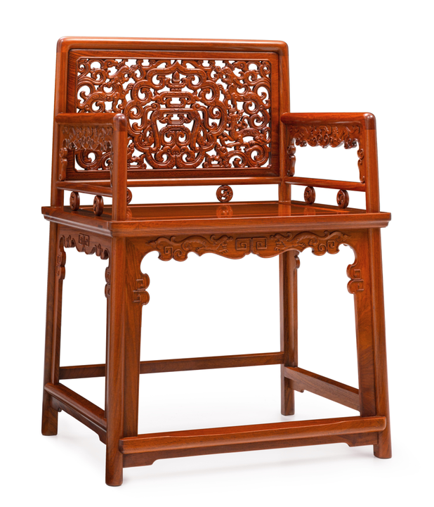 椅的靠背板由两根立材作框,中加横材两道,打槽装板,分三截攒成。透光上方中圆,浮雕抵尾双螭,翻成云纹,最下造成“亮脚”,此椅当为清早期制品。