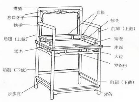 另一种造法是在搭脑及扶手横材以下一寸多的部位安横枨,横枨以下安直棂,横枨以上安卡子花,以上安直棂。