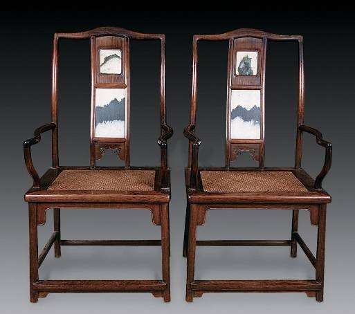 “南官帽椅”应是“四出头官帽椅”的一种改良,其搭脑和扶手都不出头,一般被认为出现在明末。苏(州)、松(江)地区的文人十分喜爱使用这种不出头的椅子,喜欢将其成对地放置于书房临窗的一面,因此被世人称为“南官帽椅”或“文椅”。