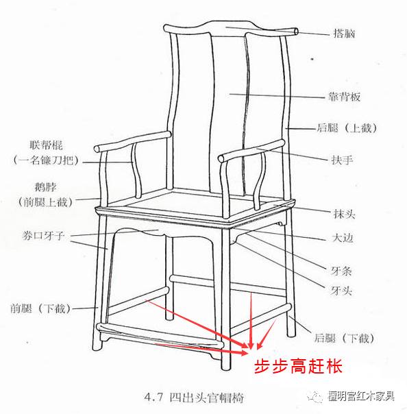 正是基于这一点,当时制造家具的木匠为了能揽到更多营生的活计,便开始迎合文人求官进仕的心理,按照他们的要求去制造家具。最突出的就是将椅子脚下的枨子做成前腿、两侧及后腿的枨子依次升高,寓意“步步高升”;或是将椅子的搭脑做成明代官帽的模样,意在附会一个“官”字。