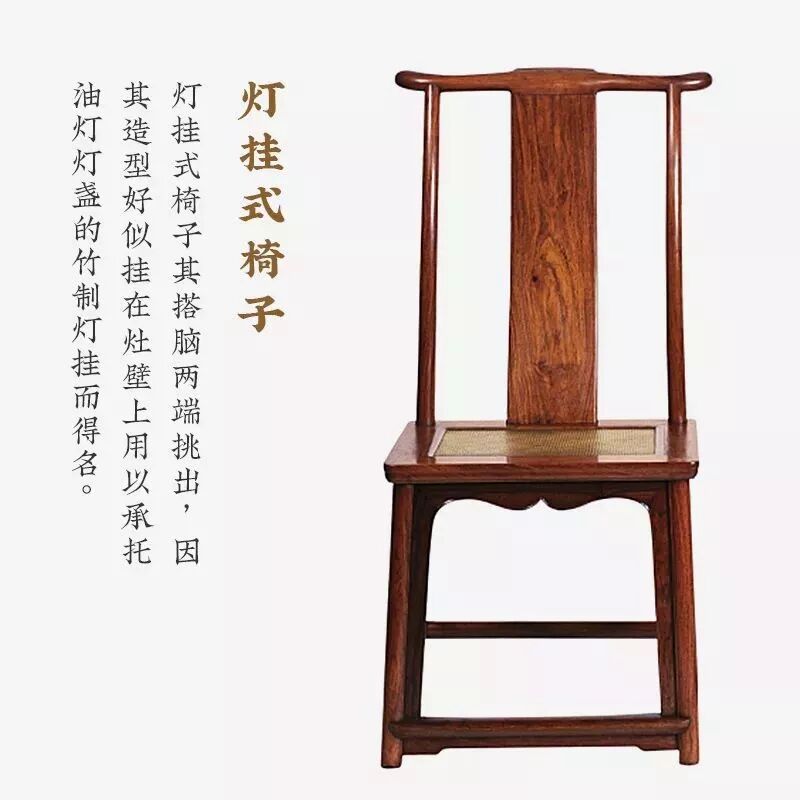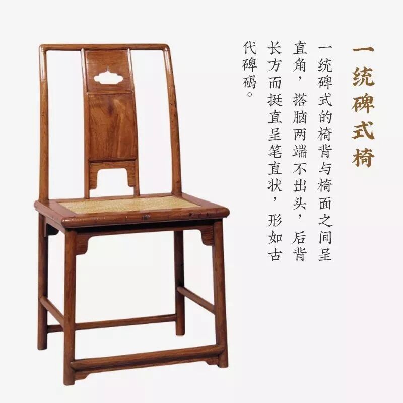 靠背由一根“搭脑”两侧两根立材和居中的靠背板构成,有“一统碑式”和“灯挂式”两种。
