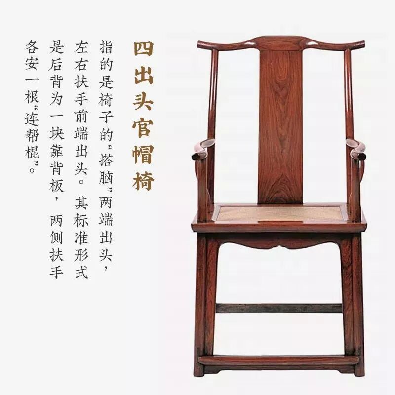 官帽椅,因其形状酷似古代官吏所戴的帽子而得名,又分为南官帽椅和四出头官帽椅。