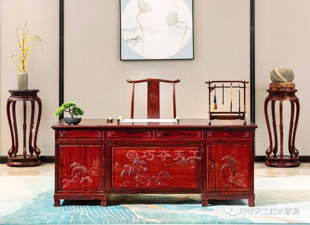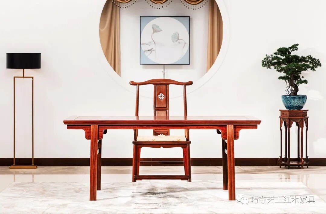 平头案取材于我国传统建筑结构“大木梁架”的造型,案面平直,无束腰,且四足缩进案面,两挡板多为雕刻装饰,优美而牢固,是不可或缺的陈设家具。书房放置条案让空间有了次序,摆放陶瓷等工艺品,装饰性极强,使书房立刻灵动起来。