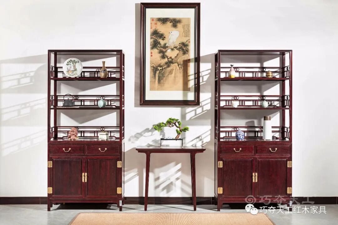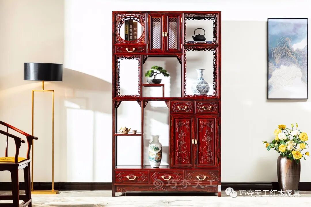 博古架除了陈设古玩,点缀美化居室外,还可用来分隔室内空间,作隔断用,既可以增强空间的层次感,又能隔离出空间,视野通透,视觉上有连续感。
