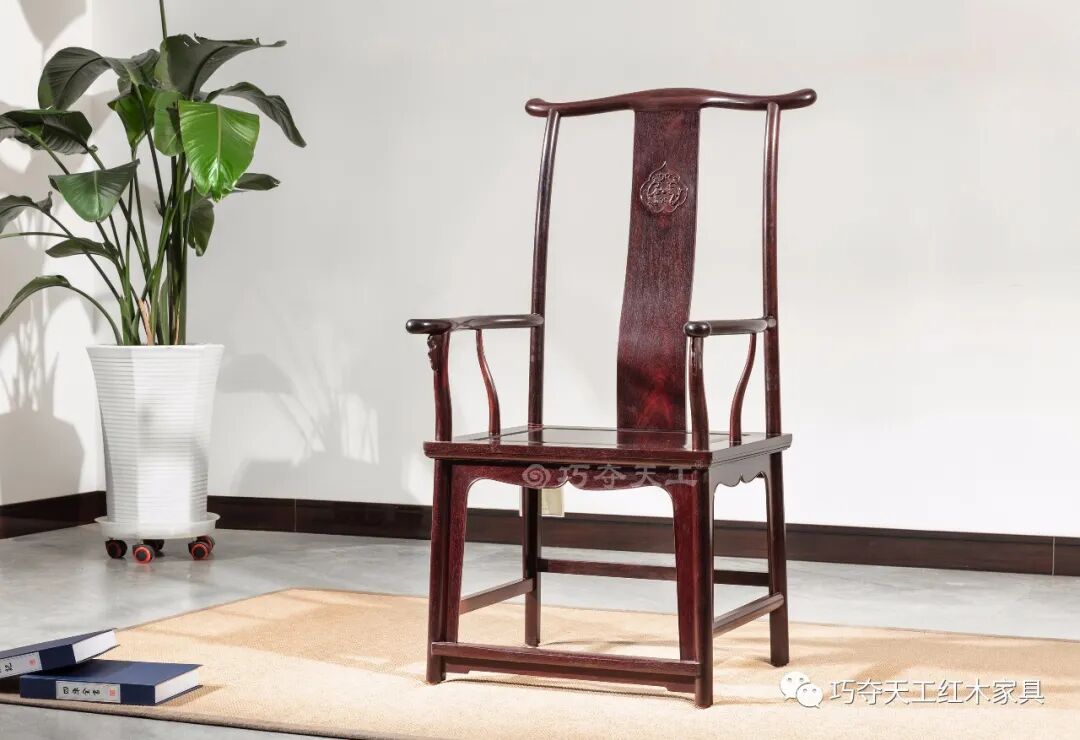 官帽椅是扶手椅中的典型代表,椅身由靠背、扶手、座面、椅腿四部分构成,无束腰。因靠背上部的枕木(又叫“搭脑”或“搭脑梁”)中间高出,左右两端微微起翘,形如古代官帽而得名。官帽椅被称为古代官员、读书人使用的椅子,今人放于书房自然合适不过。官帽椅不管从造型还是大小上,在空间中极容易搭配。