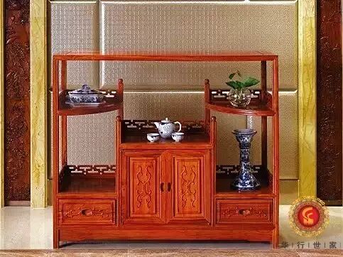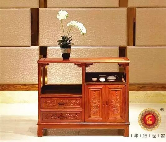 茶室家具的选择中式茶室最具代表性家具是红木家具,尤其偏爱华行红木这套茶水柜,颜色淡雅,造型独特,别有一番风情。