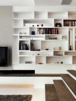 客厅博古架,整个客厅的一面墙全采用博古架的形式,避免了白色墙的单调性,也减少了墙壁装饰的费用。