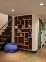 博古架在复式楼一楼的楼梯旁,增强了楼梯的单一性,充分利用空间的效果来装饰空间。