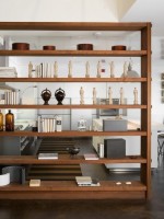 现代博古架有的是以木条为主构成以立方为单元的组合架,它们或固定在墙面、地面上,或被做成可自由移动的形式。家庭中博古架形式的隔断还有客厅中的条柜、餐厅中的配餐柜、书房中的书架,以及一些如酒柜、小型吧台、陈列架等。
