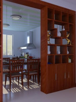 餐厅博古架隔断效果图,在进门玄关处,可以减少进门直视餐厅的不雅之象。通过博古架做隔断,上面摆放些古玩,起到了隔断和装饰的作用,显得室内的优雅。