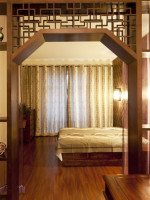 卧室采用博古架隔断,一是可以通过博古架的空隙观察外面的一举一动,保证了卧室的才刚性和透气性。二是卧室隔断拉上帘子,有可以将卧室的空间与外面隔开,拥有卧室独立的空间。