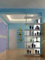 蓝色为背景墙的过道隔断,一个隔断不再让室内有一眼望到底的感觉。隔断的隔开,将室内和入门隔开,使得财气不外泄。也装饰了空间,博古架上面的古玩和室内绿色植物的摆放,增添了室内的活力。