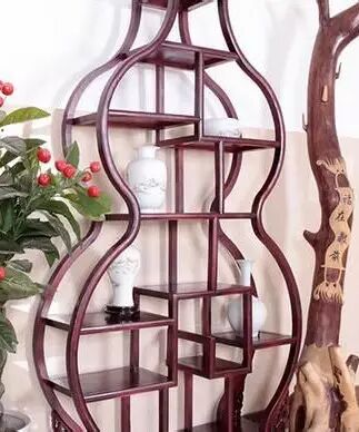 葫芦与“福禄”音相似,也是寓意很吉祥,象征着招财,加上葫芦本身的曲线很流畅、优美,这个造型的博古架给人一种很新鲜的感觉,也是一个中国传统文化的体现,让中式风格表现更极致。一般这种博古架会放在书房,当门厅柜也是很好的选择。