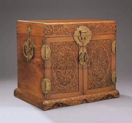 清代时,官皮箱得到了普及,它不仅具有实用性和观赏性,而且得到众人们的喜爱。慢慢的,里面放置首饰和胭脂粉儿等小物件,所以成为了妇女所使用的梳妆箱,有的雕刻吉祥图案,如喜上眉梢等。