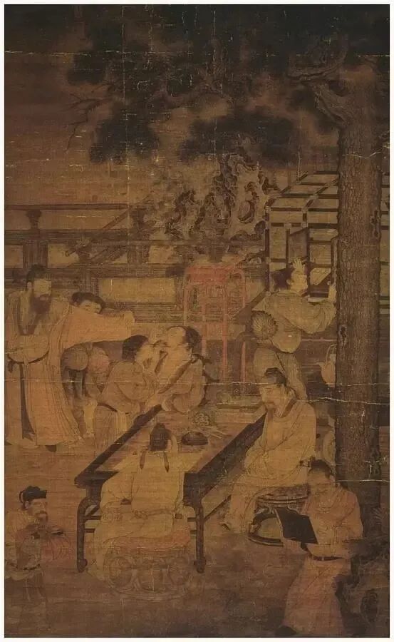 五代·周文矩《琉璃堂人物图卷》| 大桌上放着当时的书柜