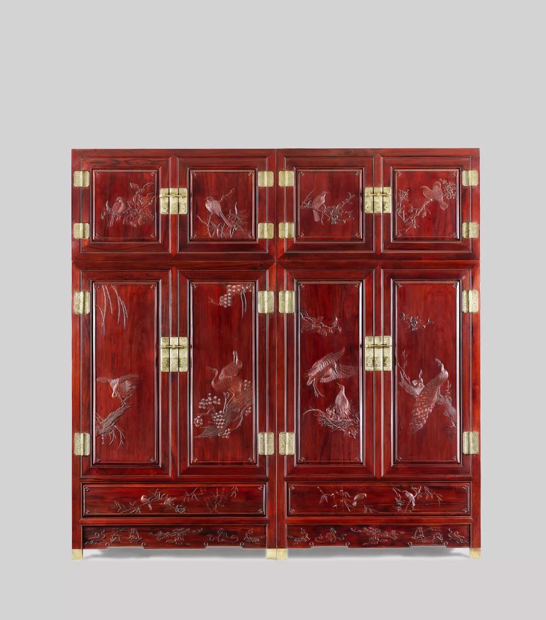 柜面整体浮雕雀鸟、孔雀等诸般瑞禽,神态各异,翩跹起舞,做工精巧,手法老练,堪称视觉盛宴。柜面的合页及插销处同样以铜件点缀,富丽堂皇,蔚为雅观。