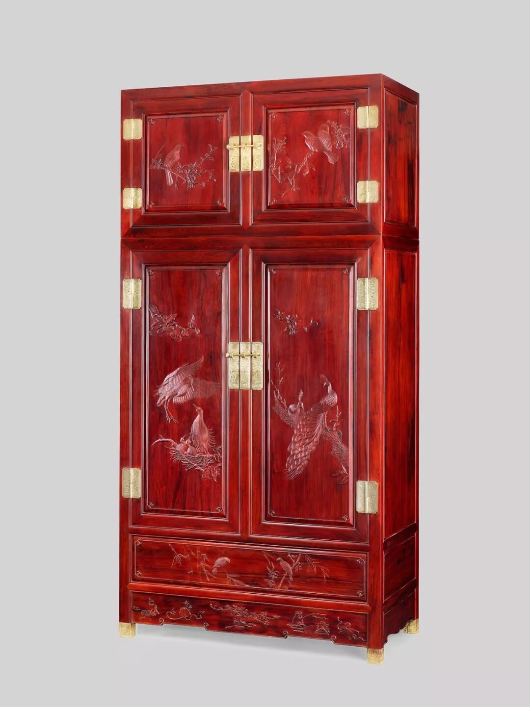 如在2017年12月,北京保利拍卖会上“清康熙御制——黄花梨鸾凤牡丹纹大顶箱柜”,拍出了9890万的高价,刷新了中国古典家具顶箱柜拍卖纪录。