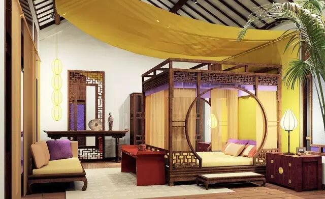 拔步床虽在室内使用,却很像一幢独立的小屋子,就像古代建筑一样,拔步床的工艺通常都采用木质髹漆彩绘,因而显得金碧辉煌。