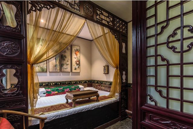 还有的在两边安上窗户,使床前形成一个回廊,回廊中间置一脚踏,两侧可以放置小桌凳、灯盏等。