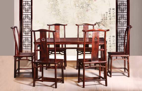 大红酸枝餐台:古典风格,雅致温润,感受别致中国风,保有木质纹理色泽,清新自然,品质奢华而不张扬,榫卯工艺,一桌六椅,实用耐用,木质工艺的结合,给你一股浓浓文化气。