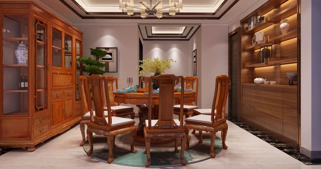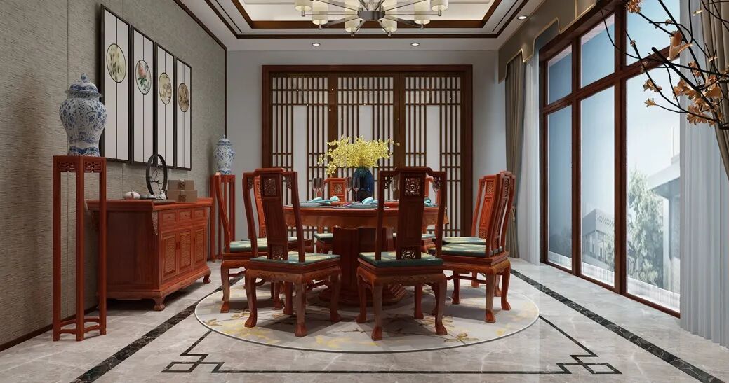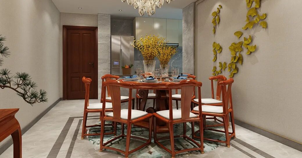 圆形为餐桌之首选。餐桌形如满月,象征一家老少和谐、团圆美满、亲密无间。圆在形状上也意味着就餐时彼此没有身份高低的界限尊卑,更能促进一大家子的沟通与交流,且圆形餐桌聚拢人气,进食氛围更加和谐美好。