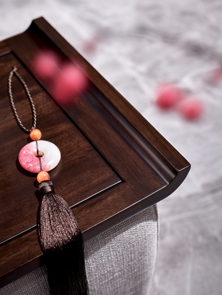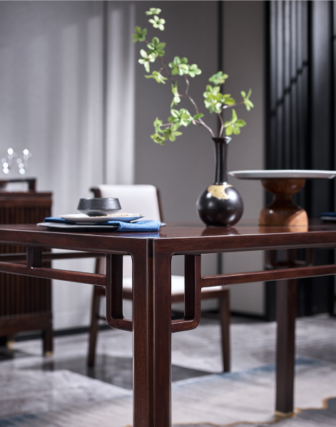 取材于自然的红木,自有一种人力无法企及的传承性,餐桌上深深浅浅的光影下,留下的是时光的印记,细水流长的生活温情及家的细微感动。