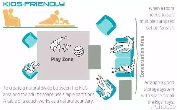 ▲ 用桌子或沙发等家具作为天然边界,将孩子的游戏区域与大人的聊天空间自然区分开。此外,不要忘了设计良好的贮存空间来放置孩子们的玩具哟。