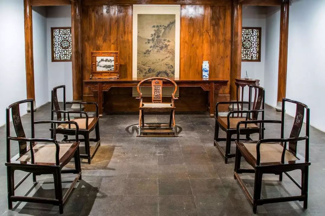 大户人家的厅堂,讲究严格有序,中规中矩,以正厅中轴线为基准,采用成组成套的对称方式摆放,家具、楹联、匾额、挂屏、书画屏条都以中轴线形成两边对称布置,庄重、高贵,非常有气派。