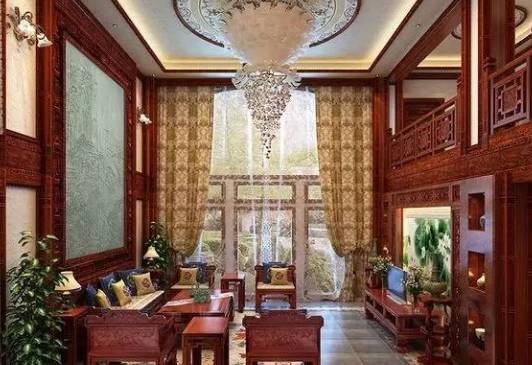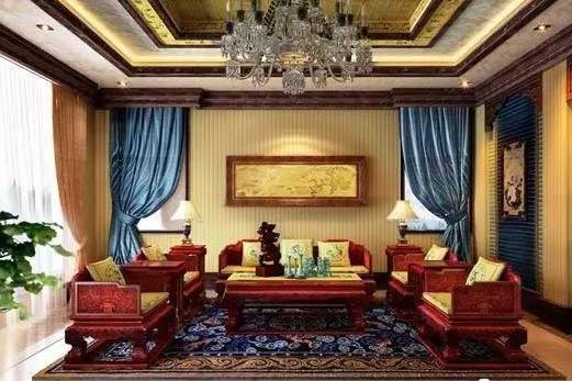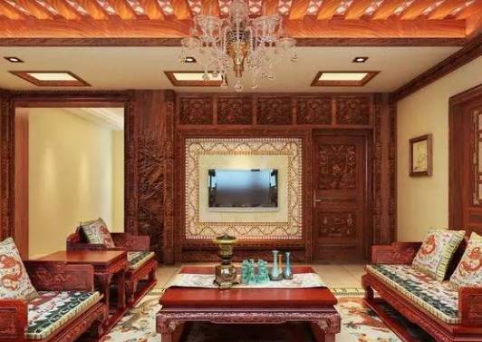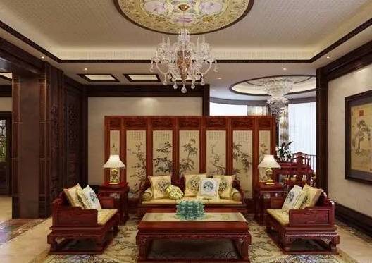 红木制成的家具可以在中式客厅布置中产生不错的效果。如果将门窗也装修成传统中式建筑中门窗的模样,那么从门窗到墙面再到客厅中摆放的红木家具,无一不在透露出浓浓的古典气息。