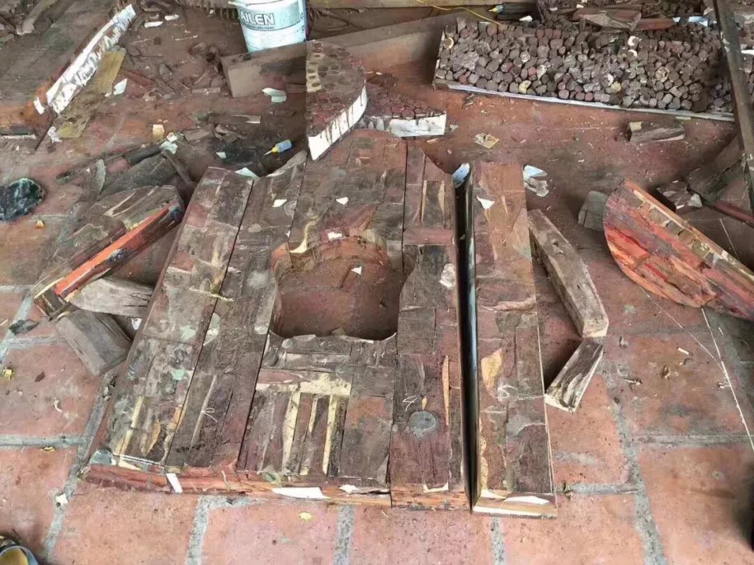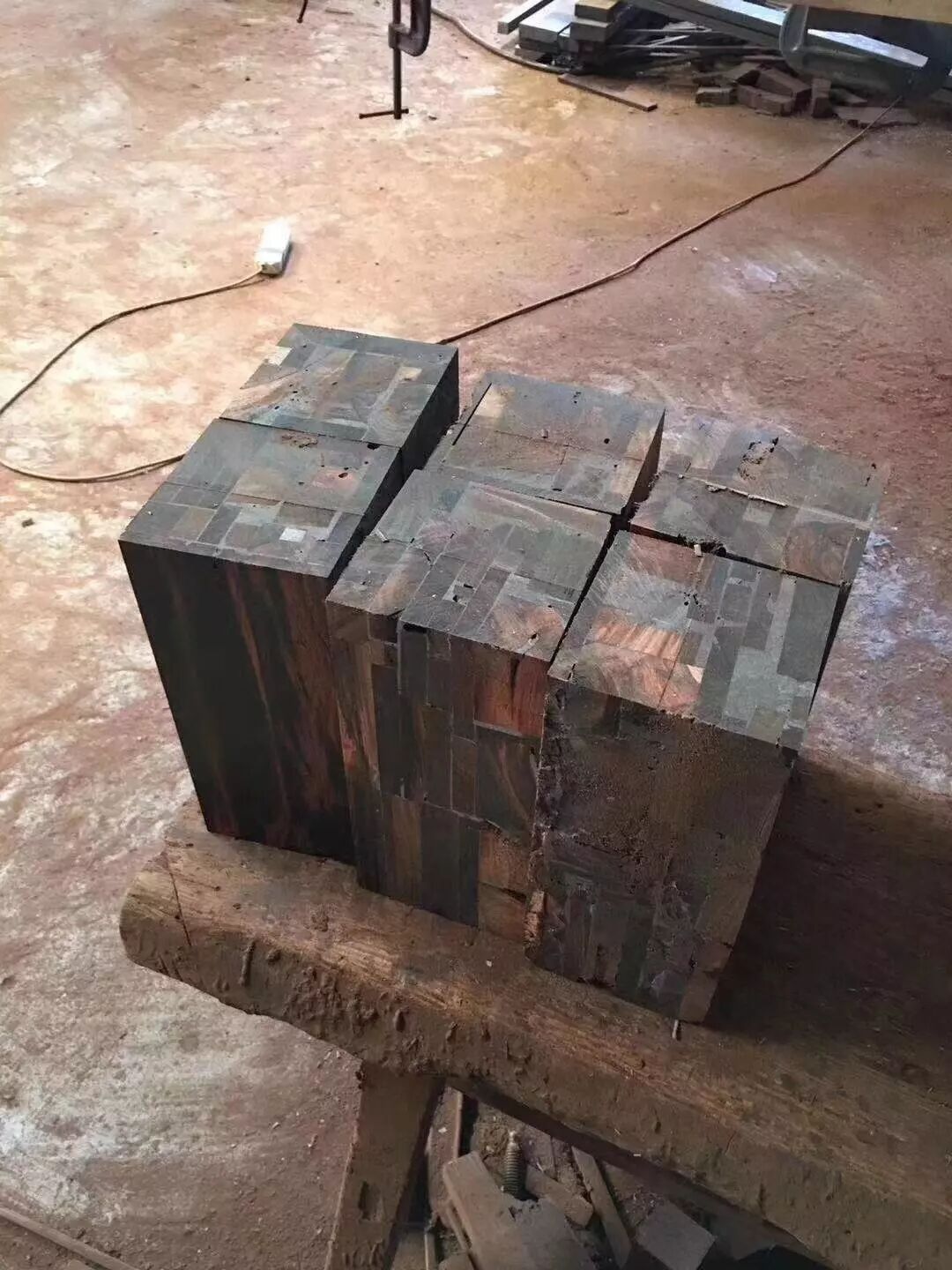 原来这套沙发在越南的时候,以为黑色是大红酸枝老料的,到了工厂,在木工的刮刀之下,颜色全部被刮没了,沙发也就原形毕露,整套沙发就没有一块好料,全部是小料拼接起来的。
