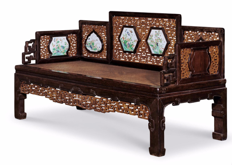 清中期 紫檀及黄杨嵌五彩花卉图瓷板罗汉床